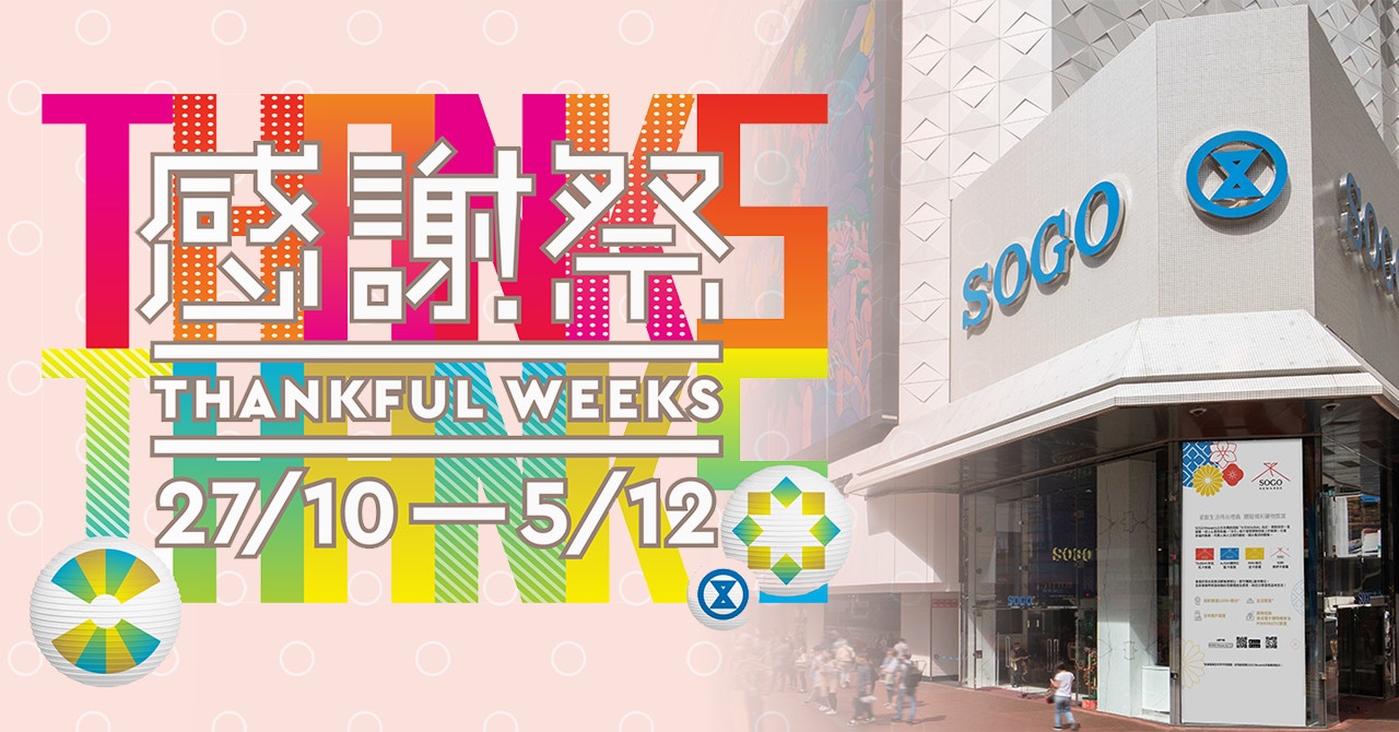 又到一年一度的 Sogo Thankful Week 祟光感謝祭. 半年一度的崇光百貨崇光感謝周年慶SOGO Thankful Week 2019本月10日開始於周日26日結束有美國護膚品牌專櫃店長表示感謝祭為每年重大事件會預早半年開始籌備每年5月份營業額最重要如果做得唔好基本上條數都會好差而5月的感謝祭結束後已經要開始著手準備11月的另一次感謝祭感謝祭期間來自大江南北的顧客逼爆百貨公司每天要. Sogo Thankful Week 2019 11 月感謝祭由 11 月 6 至 24 日於祟光百貨銅鑼灣店及尖沙咀店同時舉行由 10 月 25 日起顧客可以透過崇光網上商店優先訂購感謝祭精選貨品搶先購得心頭好SOGO Reward 會員凡於 10 月 25 日至 11 月 5 日期間在崇光網上商店購物可享 2 倍 SOGO Rewards 積分.